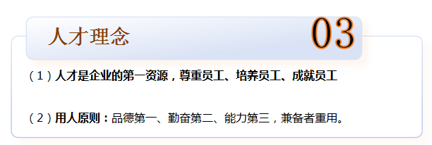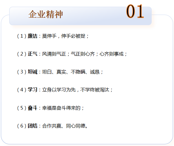 核心价值观:客户为上,品质为本;正气为魂、务实为行